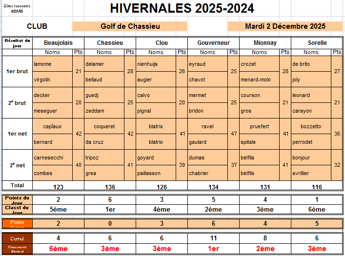 Merci à tous les participants pour cette magnifique journée et un grand bravo à Chassieu qui finit à la 1re place sur la journée. Merci à Maurice Delamer 2e en brut, Jean François Coqueret 3e, et aussi à Thierry Valle 3e en net.