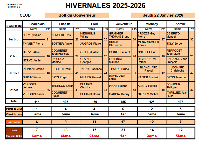 Merci à tous les participants pour cette magnifique journée et un grand bravo à Chassieu qui finit à la 1re place sur la journée. Merci à Maurice Delamer 2e en brut, Jean François Coqueret 3e, et aussi à Thierry Valle 3e en net.